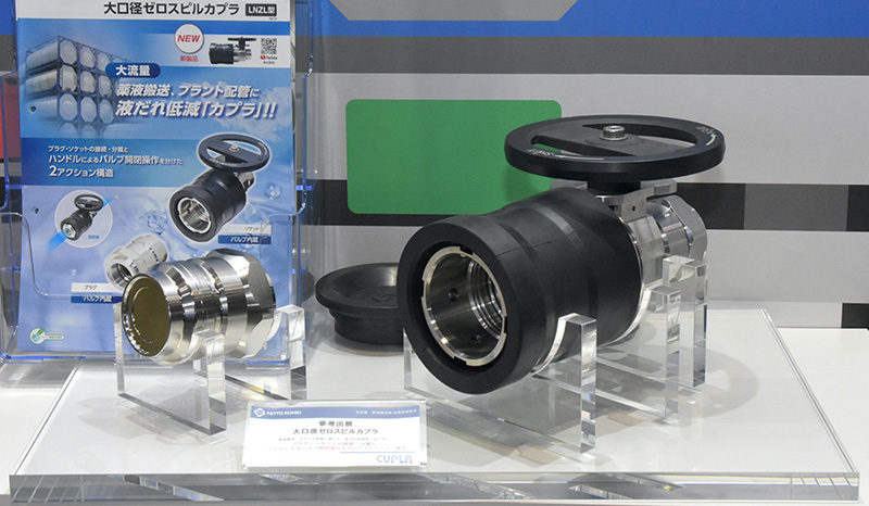 日東工器(株)は、薬液搬送やプラント配管に適した液だれを低減する大口径ゼロスピルカプラ『LNZL型』の展示を行っていた。