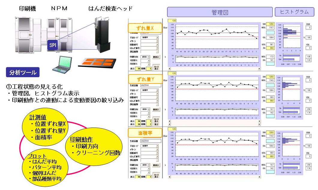 図6に印刷工程分析ツールの例を示す。当社商品であるNPMのはんだ印刷検査ヘッドで印刷の位置ずれ量、印刷面積を計測して図に示すように管理図、ヒストグラムで表し印刷状態を管理する。そして印刷状態が変動した場合に印刷動作や実装基板情報と連動して要因を絞り込む。