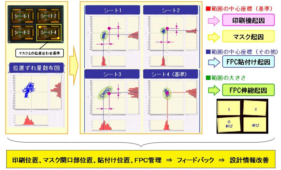 まず、シート4は印刷用マスクの位置合わせ基準としているので、印刷位置の中心座標のずれの要因は印刷機、マスク起因である。そして、シート4の中心座標と各シートの中心座標のずれ量はFPC基板の貼り付けのばらつきである。そして、各シートにおける印刷位置のばらつき範囲はFPC伸縮が要因である。このように不良発生要因が設備、材料(基板)、貼り付け方法と切り分けできる。