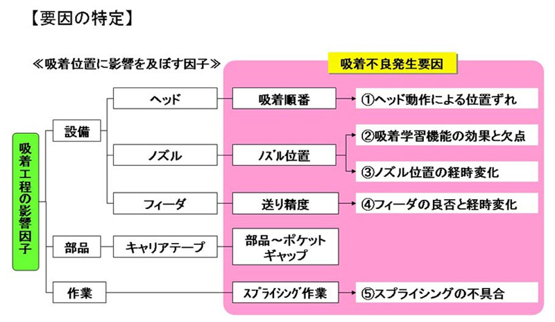 次にマウンタで部品を吸着する工程での不良発生要因としては、図8に示すように設備、部品、作業に大別され、特に設備ではヘッド、ノズル、フィーダに分けられる。