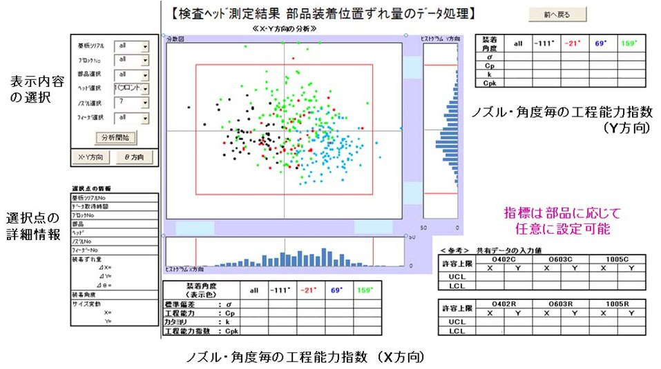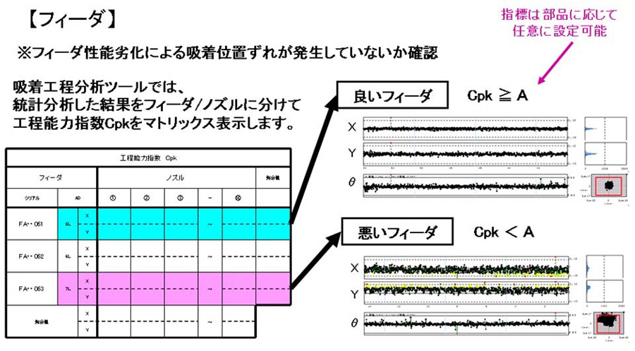 図10にフィーダの部品吸着状態を工程能力指数の算出機能と管理図と散布図で管理する場合を示す。たとえば、この分析ツールによって、フィーダの劣化が管理でき、部品サイズに応じたフィーダの選別ができるようになる。