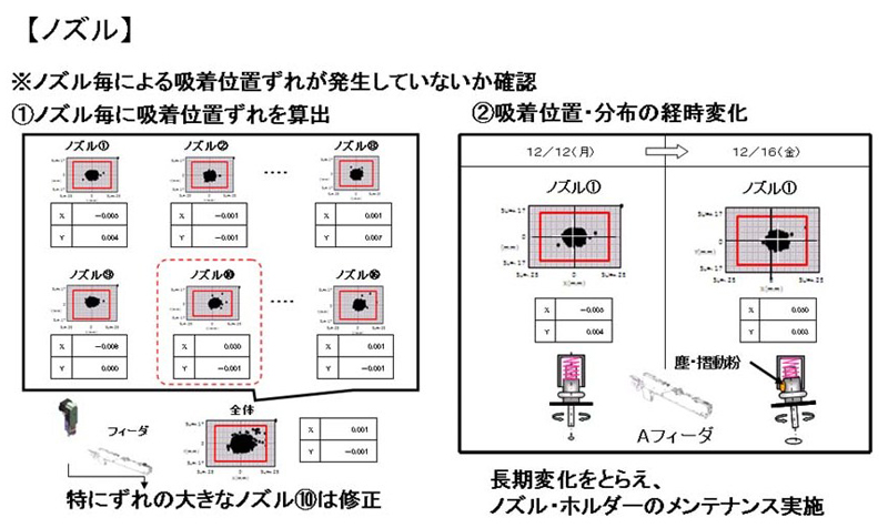 部品の装着精度はリフロー品質に直接影響するので、検査ヘッドで不良が発生してからでは手遅れである。この分析ツールによって、ノズル交換やノズルメンテナンスを的確に行い、不良を予防できる。