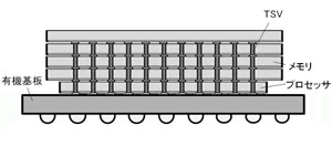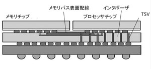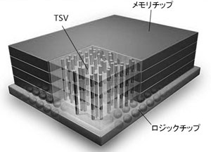 現在目標になっているのは512ビットのバス(配線数は約1300個)で12.5GBpsのバンド幅を実現することで、その構造を図2に示す。最上層のメモリチップにはTSVは不要でフリップチップ構造になる。メモリ容量が充分ならばメモリチップが1個の場合もある。TSVの端子配置は米国のJEDEC(規格審議団体)で決定され開発が進んでいるが、2013年には実現すると期待されている。