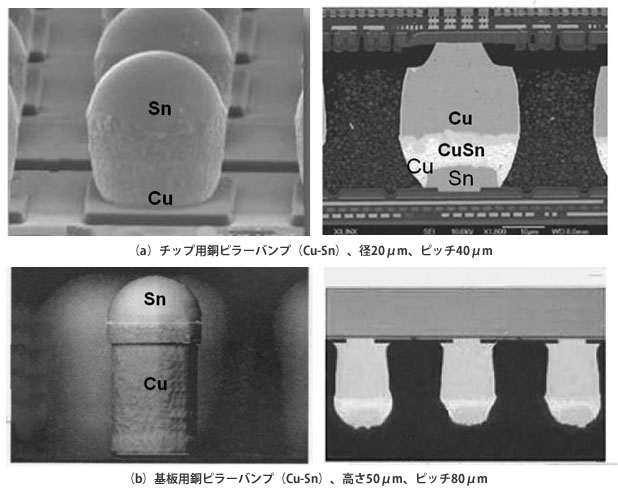 ワイドIOなどの開発でTSVの必要数が増加して、必然的にバンプピッチが小さくなり、フリップチップ時代は150μm以上だったピッチは最近は40?50μm前後になりつつあり、従ってバンプ直径は20?25μm程度が標準になりつつある。微小ピッチでははんだ材(熔融金属)が隣のバンプと接触するのを防ぐためはんだ量は少なくなるが、バンプ高さを保持するためには図7(a)に示すように、棒状の銅ピラー(柱)をたて、はんだ材には主としてSnを使う。他にSnAg、Au、Inなども報告されている。 Snはボンディング時にCuと合金を作り、少量のために図のように全体がSn-CuのIMC(金属間化合物)になり、一般に融点が高くなる。従ってボンディング後は再度融点まで上げてもSnは熔解しない。チップを有機基板へボンディングする場合は基板の凹凸を吸収するためにCuピラーを更に高くする。それらの例を図7(b)にしめす。
