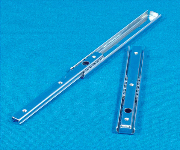 プレス成形による小型スライドレール。特徴は、①リニアモーションタイプで、アウターメンバーの中をインナーメンバーが直線運動するレール、②スライド長さ:8...