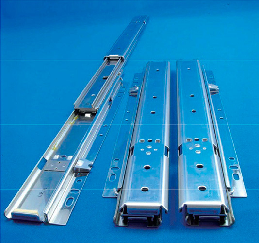 板ばね操作によりインナーメンバーの引き抜きが可能なスライドレール。特徴は、①板ばねは収納時のロック方法によって3タイプを用意、②スライドレールの定番サ...